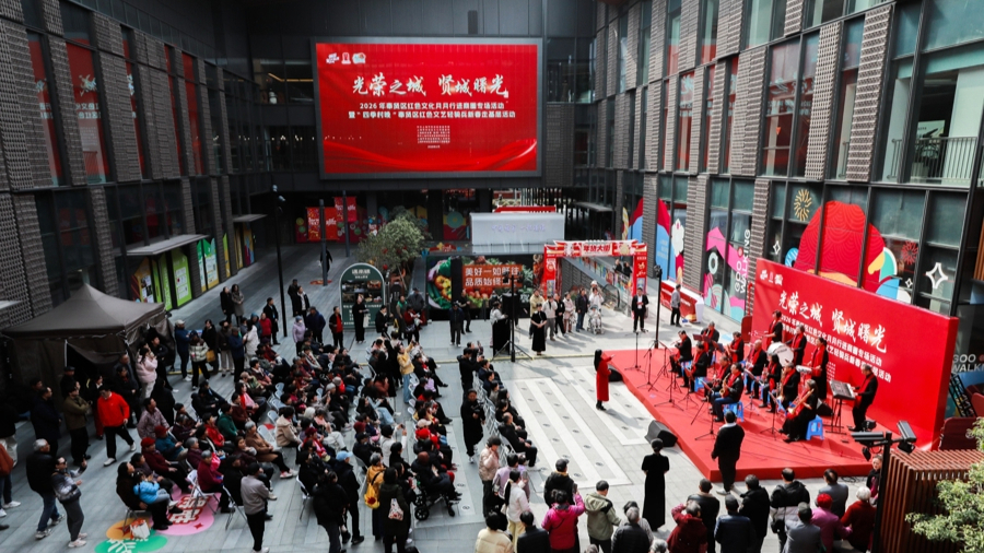 2月28日下午,“光荣之城 贤城曙光”2026年奉贤区红色文化月月行进商圈专场活动暨“四季村晚”奉贤区红色文艺轻骑兵新春走基层活动在古华庭举办。活动以文化展演和便民市集联动形式,将情景演绎、宣讲教育、互动问答等多元内容融为一体,为市民群众献上一场新春思想盛宴。